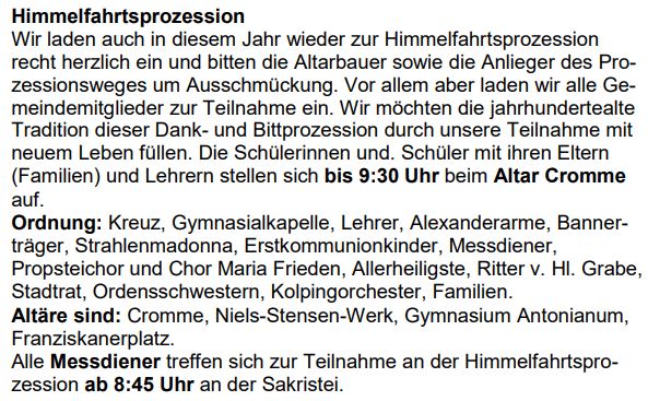 Die Aufstellung zur Teilnahme findet am Altar Comme statt. Infos zur Reihenfolge bitte dem Anhang „Pfarrnachrichten_Vechta_Himmelfahrtsprozession“ entnehmen.