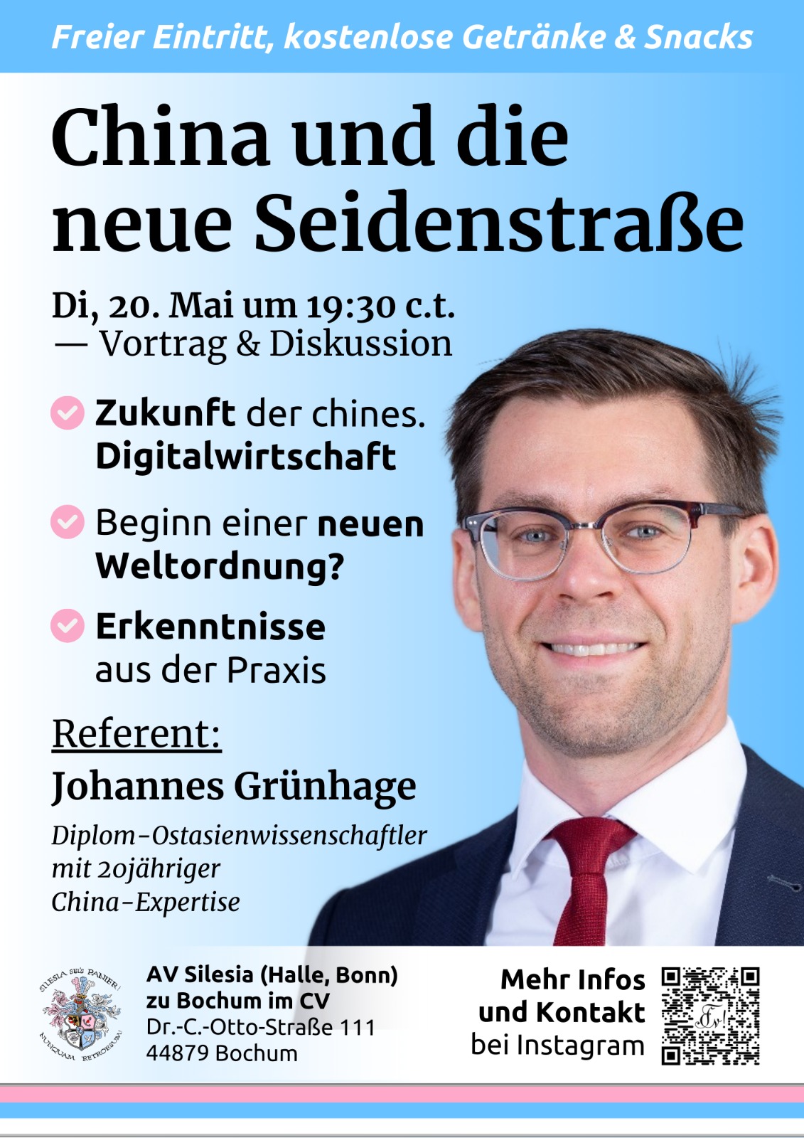 wir lagen herzlich ein zum Votrag „China und die neue Seidenstraße“ am Dienstag, 20.05.2025 um 19:30 c.t. Ein besonderer Fokus wird dabei auf der chinesischen Digitalwirtschaft liegen.