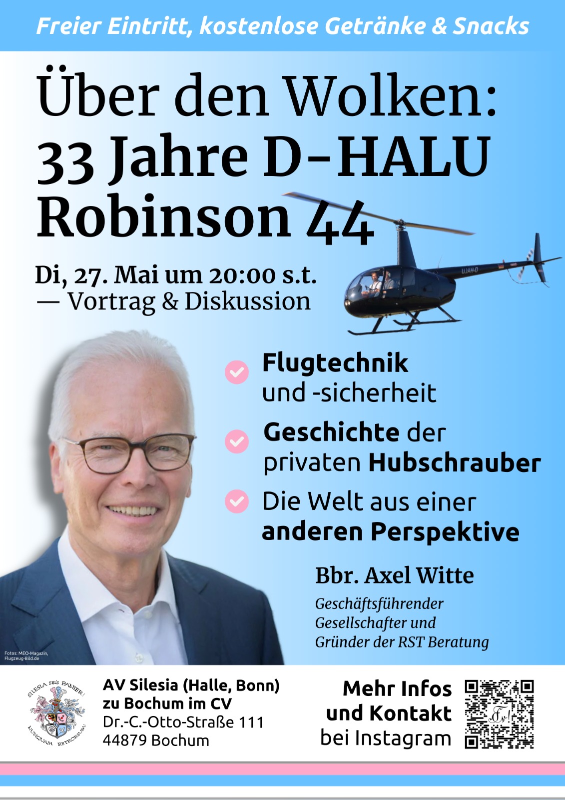 Am 27.05. begrüßen wir unseren Bundesbruder AH Axel Witte bei uns adH. Dieser wird uns ab 20.00 s.t. zum Thema „Über den Wolken: 33 Jahre D-HALU Robinson 44“ referieren.
