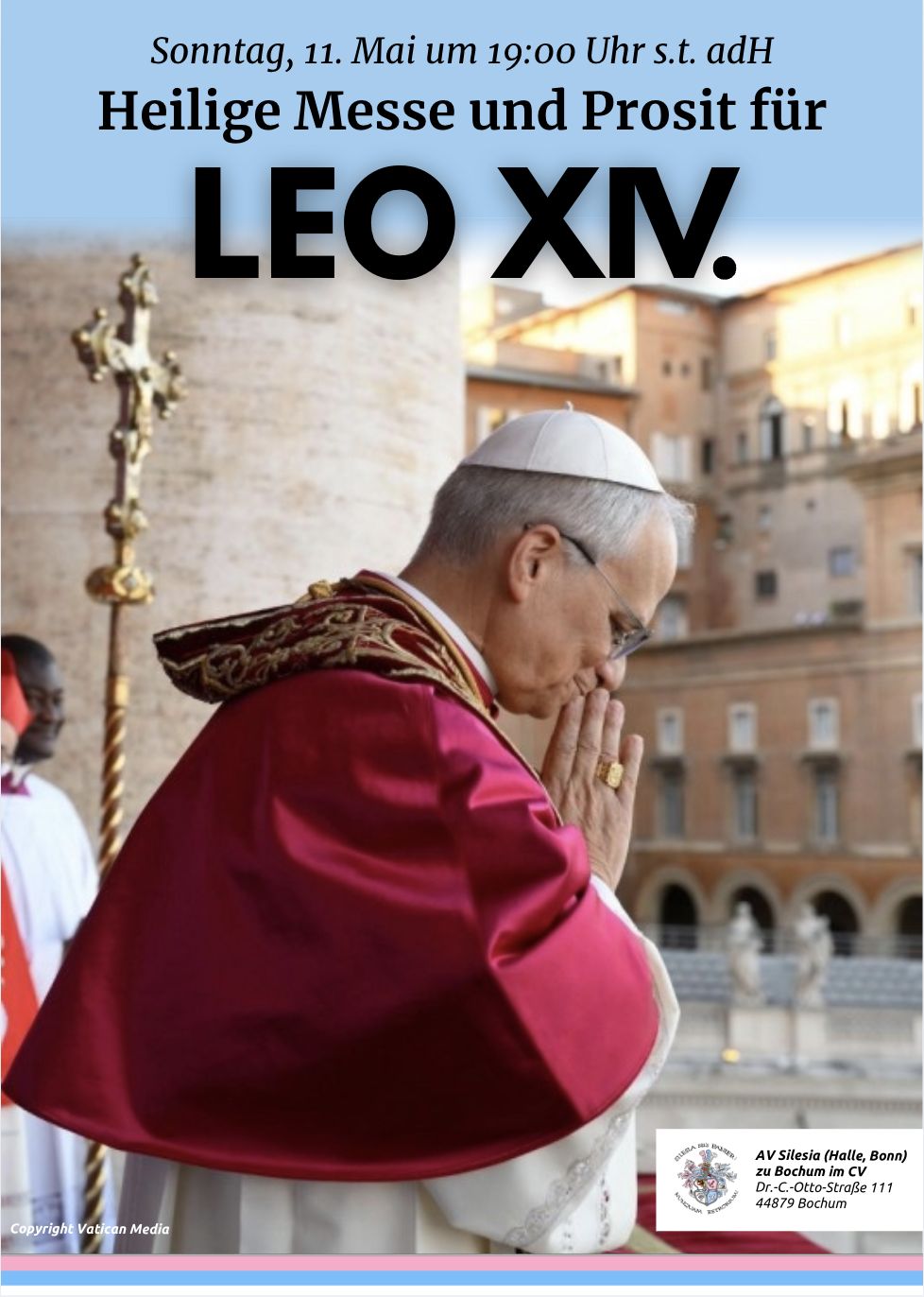 am morgigen Sonntag feiern wir um 19:00 Uhr s.t. mit unserem Philistersenior Holger Schmitz Rt-D! Si! auf unserem Silesenhaus eine Heilige Messe für unseren neuen Papst Leo XIV. Danach folgt ein lockerer Prosit auf den Heiligen Vater!